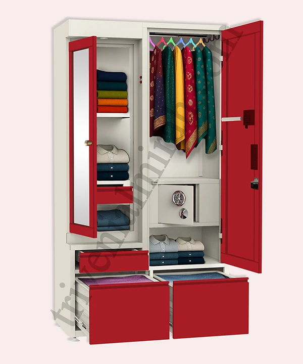 Step into a world where style meets structure. This vibrant maroon and white wardrobe is designed for those who value both aesthetics and functionality. With a secure built-in safe, spacious drawers, and a playful mix of colorful hangers, it’s more than just storage—it’s a statement.