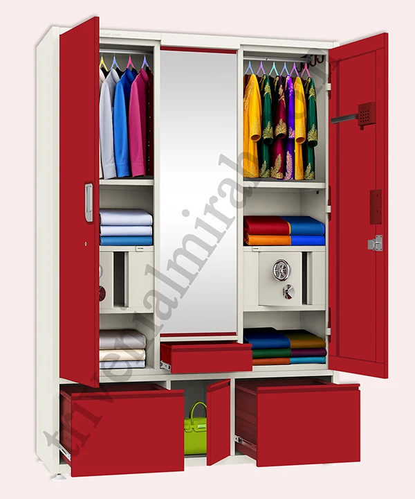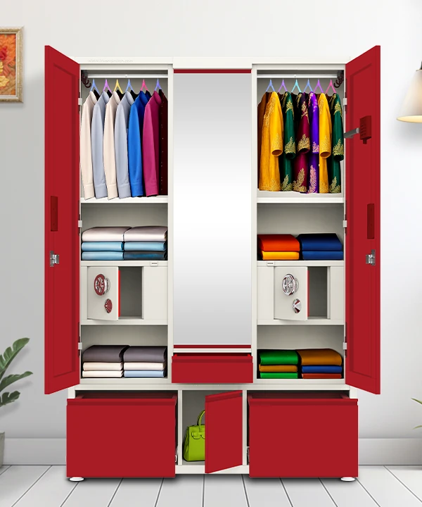 Step into a world where style meets structure. This vibrant maroon and price grey wardrobe is designed for those who value both aesthetics and functionality. With a secure built-in safe, spacious drawers, and a playful mix of colorful hangers, it’s more than just storage—it’s a statement.