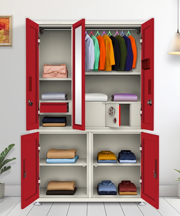 Step into a world where style meets structure. This vibrant maroon and white wardrobe is designed for those who value both aesthetics and functionality. With a secure built-in safe, spacious drawers, and a playful mix of colorful hangers, it’s more than just storage—it’s a statement.