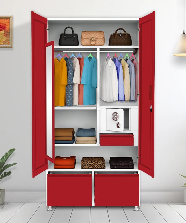 Step into a world where style meets structure. This vibrant red and white wardrobe is designed for those who value both aesthetics and functionality. With a secure built-in safe, spacious drawers, and a playful mix of colorful hangers, it’s more than just storage—it’s a statement.