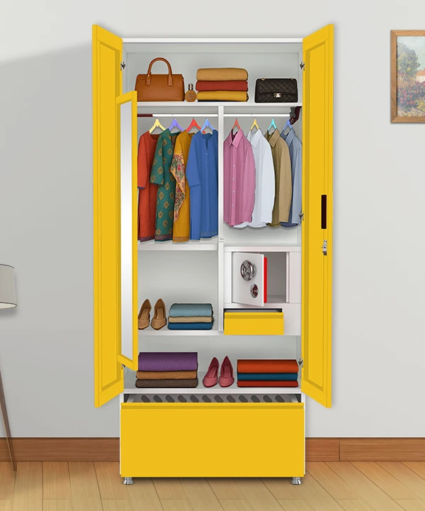 Step into a world where style meets structure. This vibrant Yellow and white wardrobe is designed for those who value both aesthetics and functionality. With a secure built-in safe, spacious drawers, and a playful mix of colorful hangers, it’s more than just storage—it’s a statement.