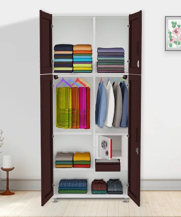 Step into a world where style meets structure. This vibrant coka and white wardrobe is designed for those who value both aesthetics and functionality. With a secure built-in safe, spacious drawers, and a playful mix of colorful hangers, it’s more than just storage—it’s a statement.